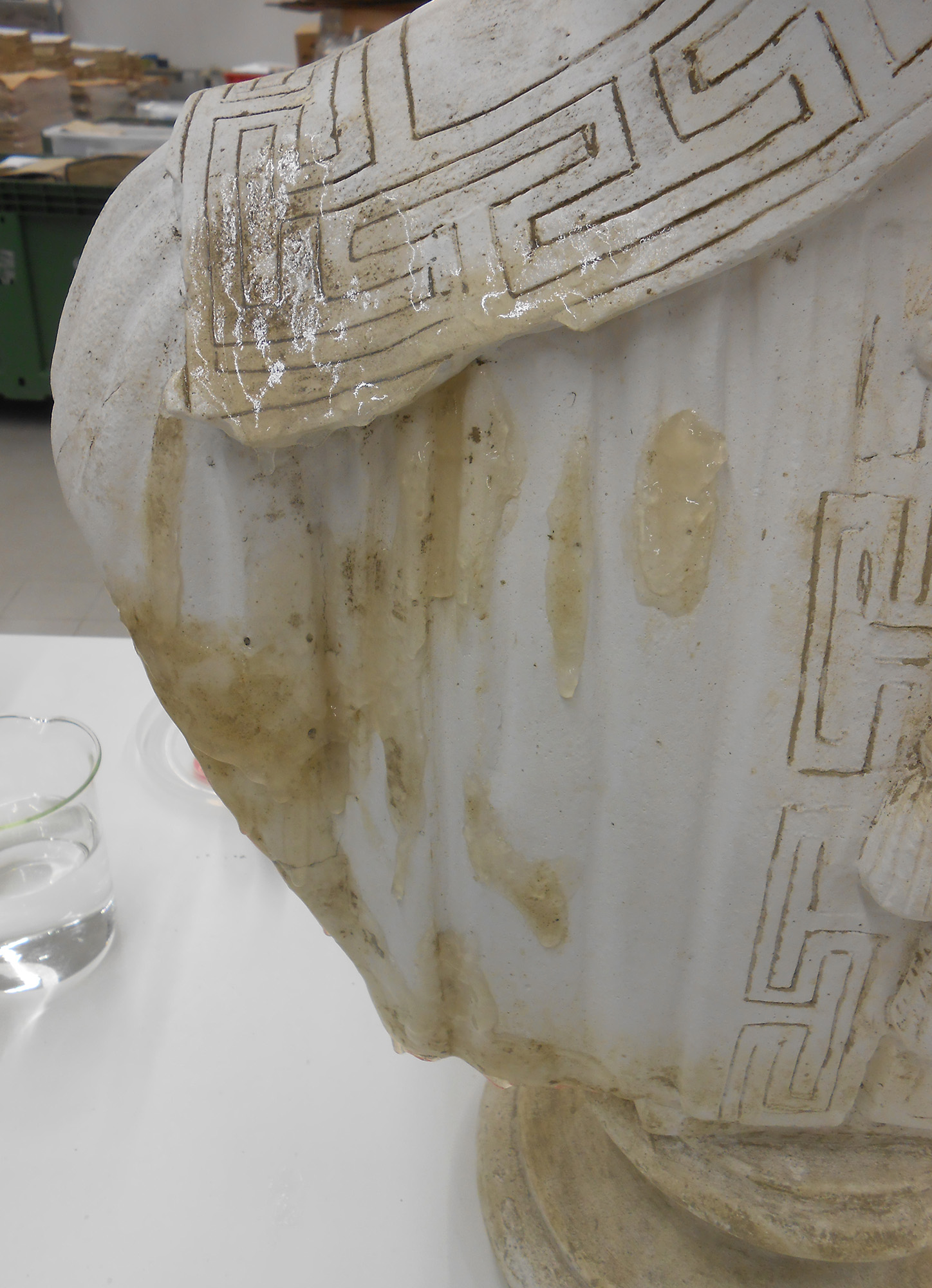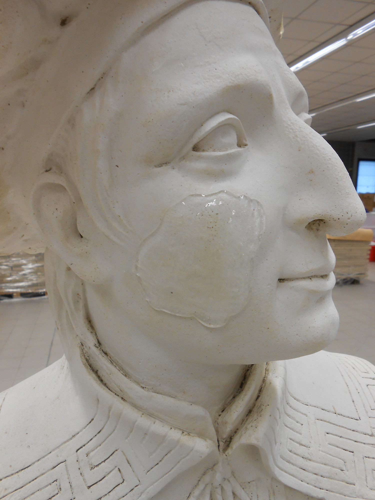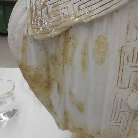Fasi di restauro del busto raffigurante Antonio Merenda con riposizionamento dei frammenti staccati e pulitura mediante gel di PVA-Borace additivato con Alcol Benzilico per la rimozione dello strato di cera alterato