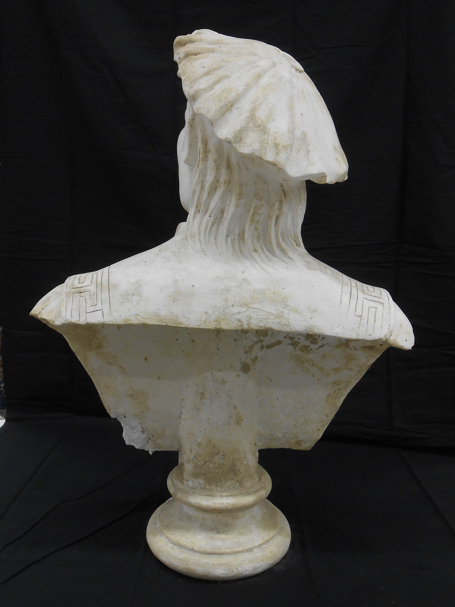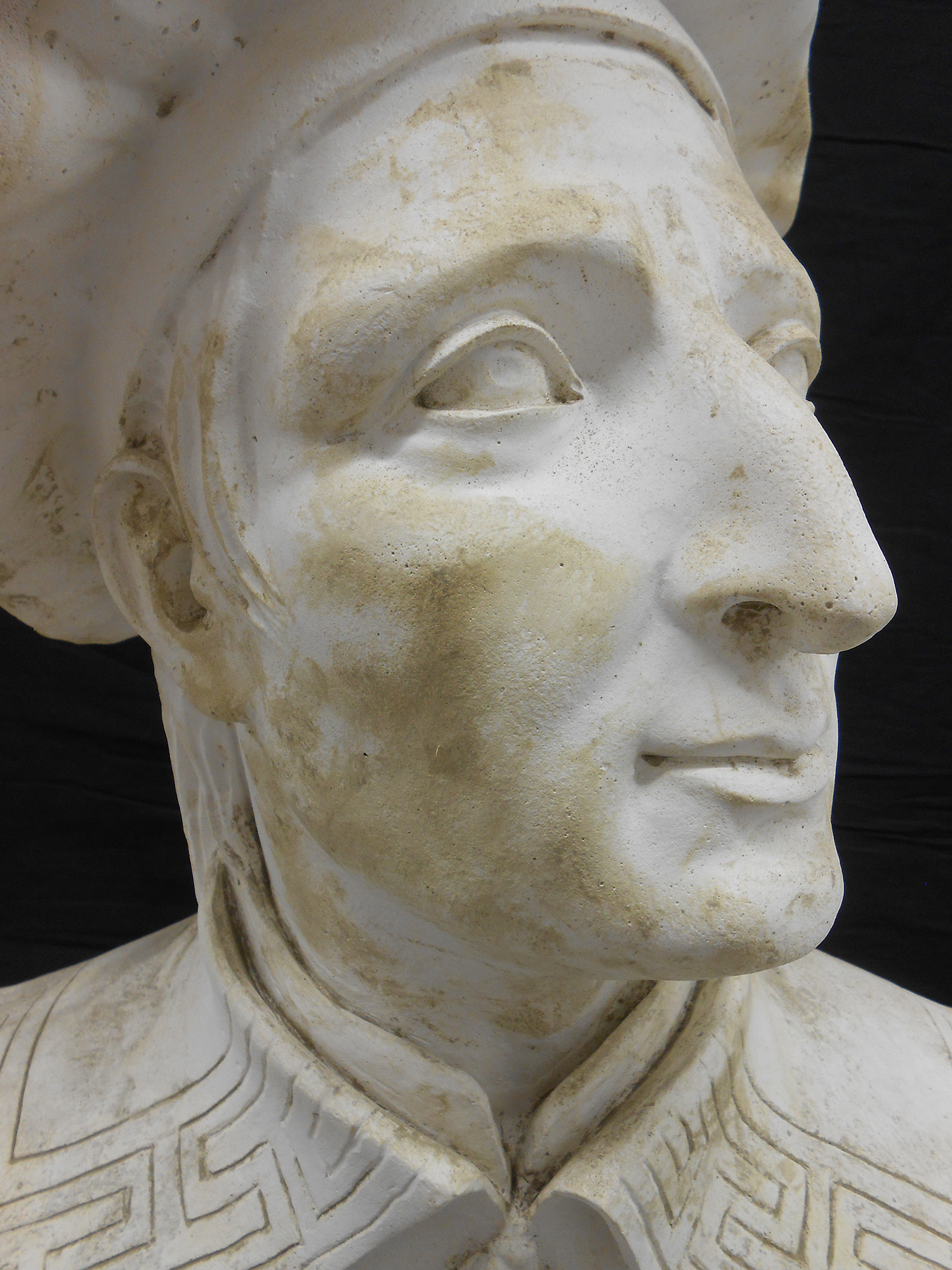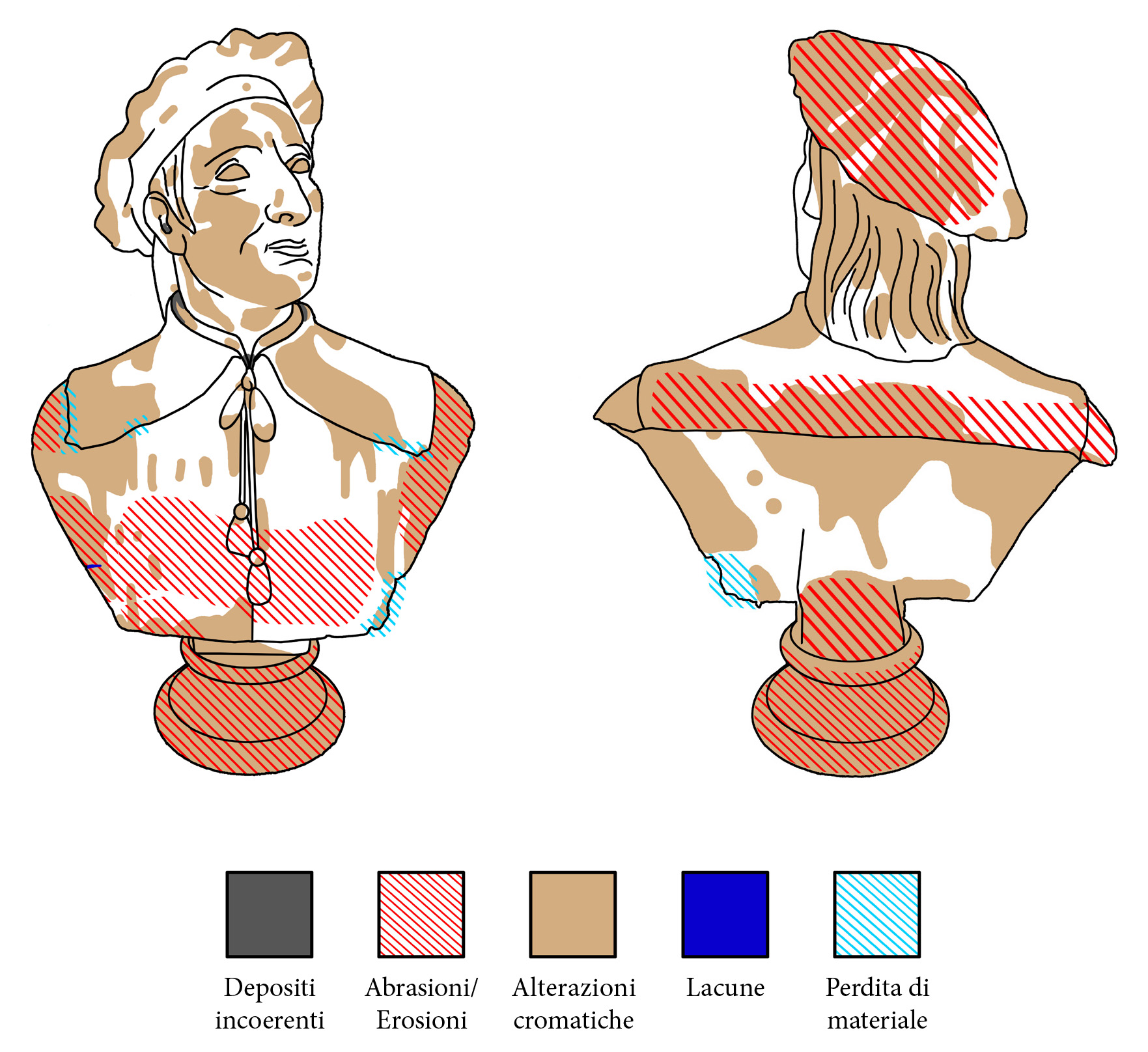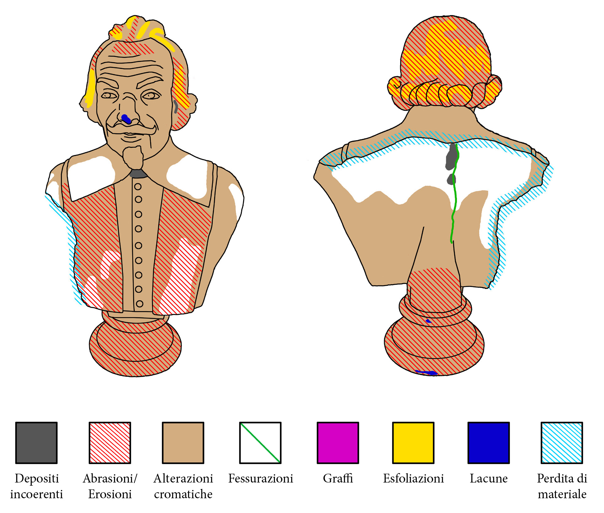I busti riportavano sulla superficie alterazioni cromatiche e macchie dovute al fango alluvionale, che ne deturpavano l’aspetto creando un evidente danno estetico, oltre a circoscritte fessurazioni e mancanze di modellato scultoreo. A differenza degli altri, il busto raffigurante Antonio Merenda presentava uno strato superficiale liscio e lucido fortemente alterato, dovuto alla stesura di un protettivo idrorepellente durante un intervento pregresso, e importanti perdite di materiale con distacco di frammenti nel suo fianco destro e sul retro.