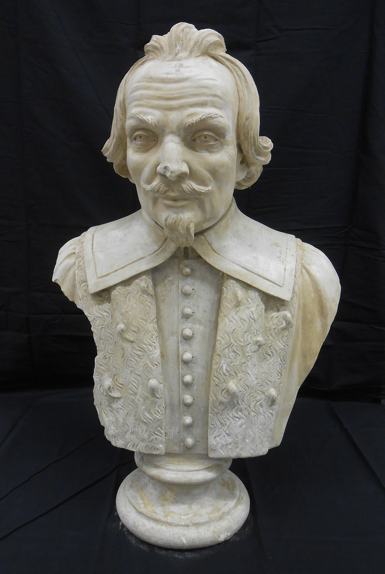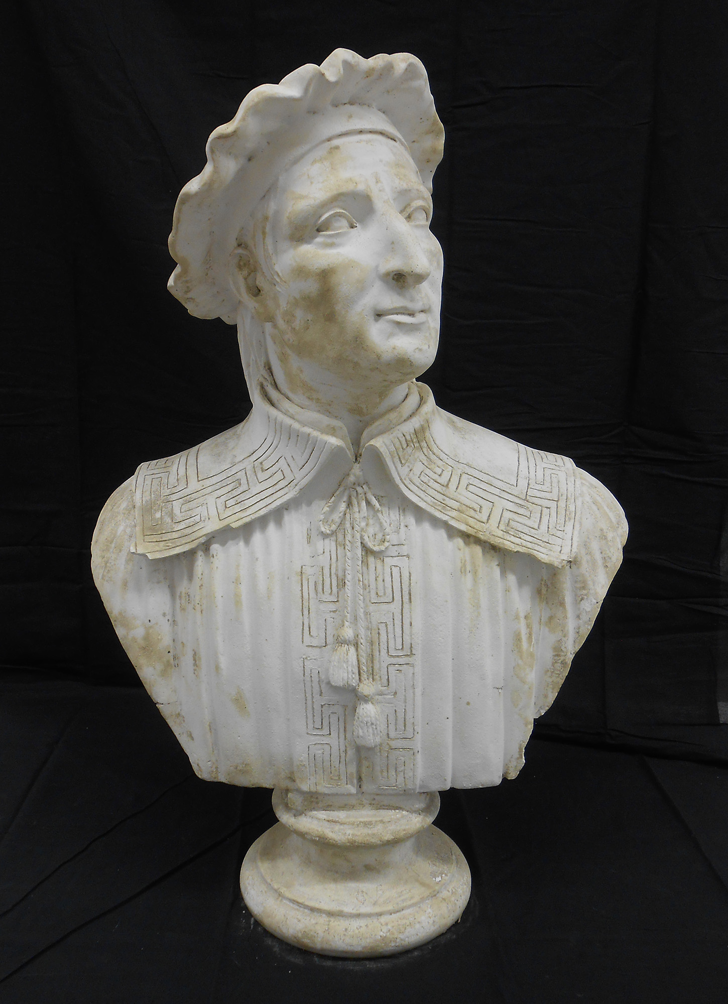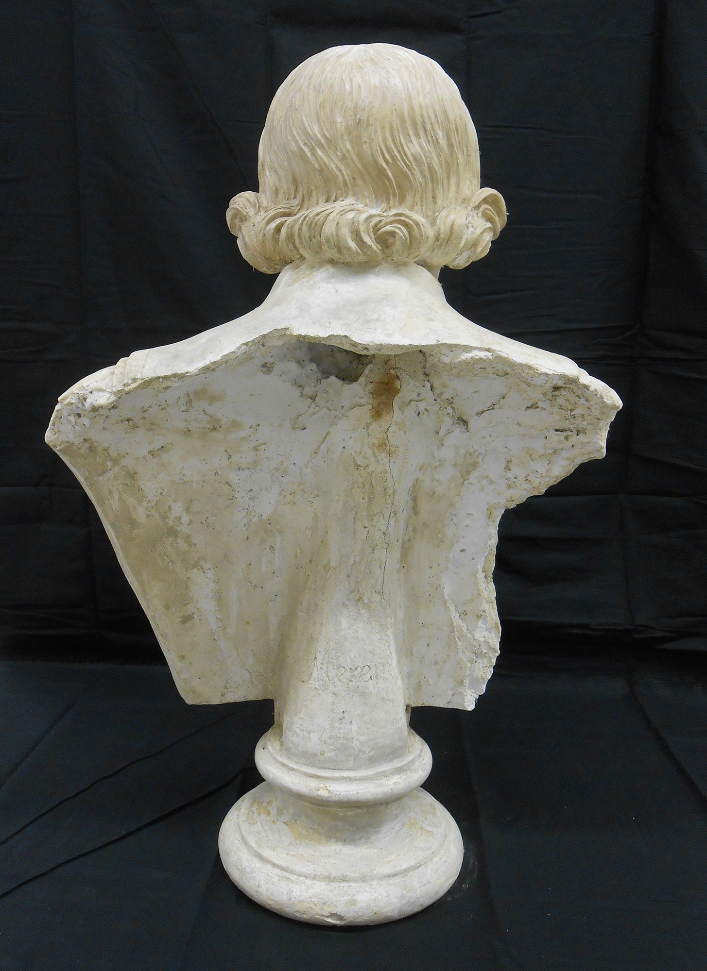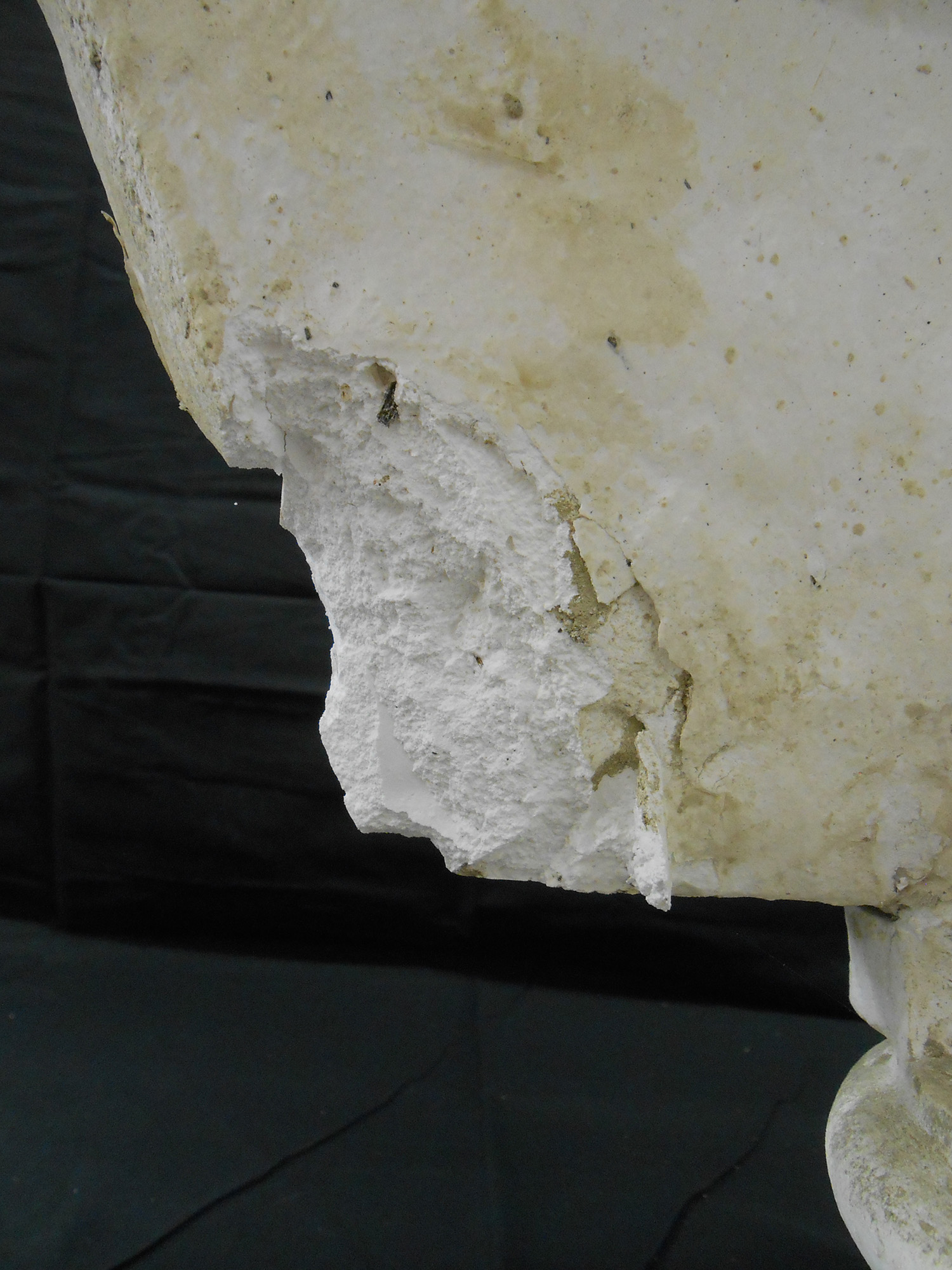 I busti riportavano sulla superficie alterazioni cromatiche e macchie dovute al fango alluvionale, che ne deturpavano l’aspetto creando un evidente danno estetico, oltre a circoscritte fessurazioni e mancanze di modellato scultoreo. A differenza degli altri, il busto raffigurante Antonio Merenda presentava uno strato superficiale liscio e lucido fortemente alterato, dovuto alla stesura di un protettivo idrorepellente durante un intervento pregresso, e importanti perdite di materiale con distacco di frammenti nel suo fianco destro e sul retro.
